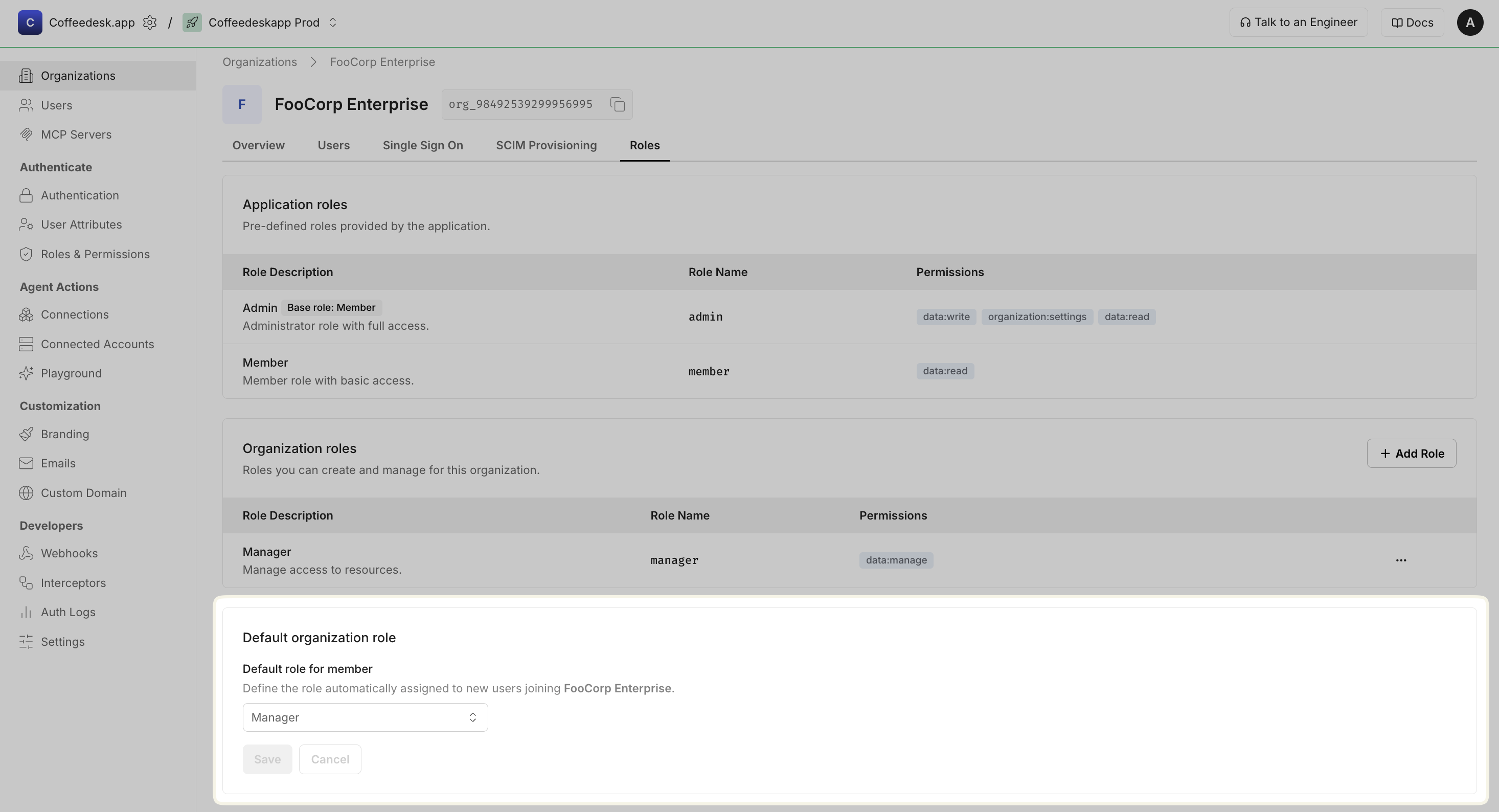 Section titled “Set a default role for new organization members”You can also configure a default role that is automatically assigned to users who join a specific organization. This organization-level setting overrides the application-level default role described above, allowing finer-grained control per organization.