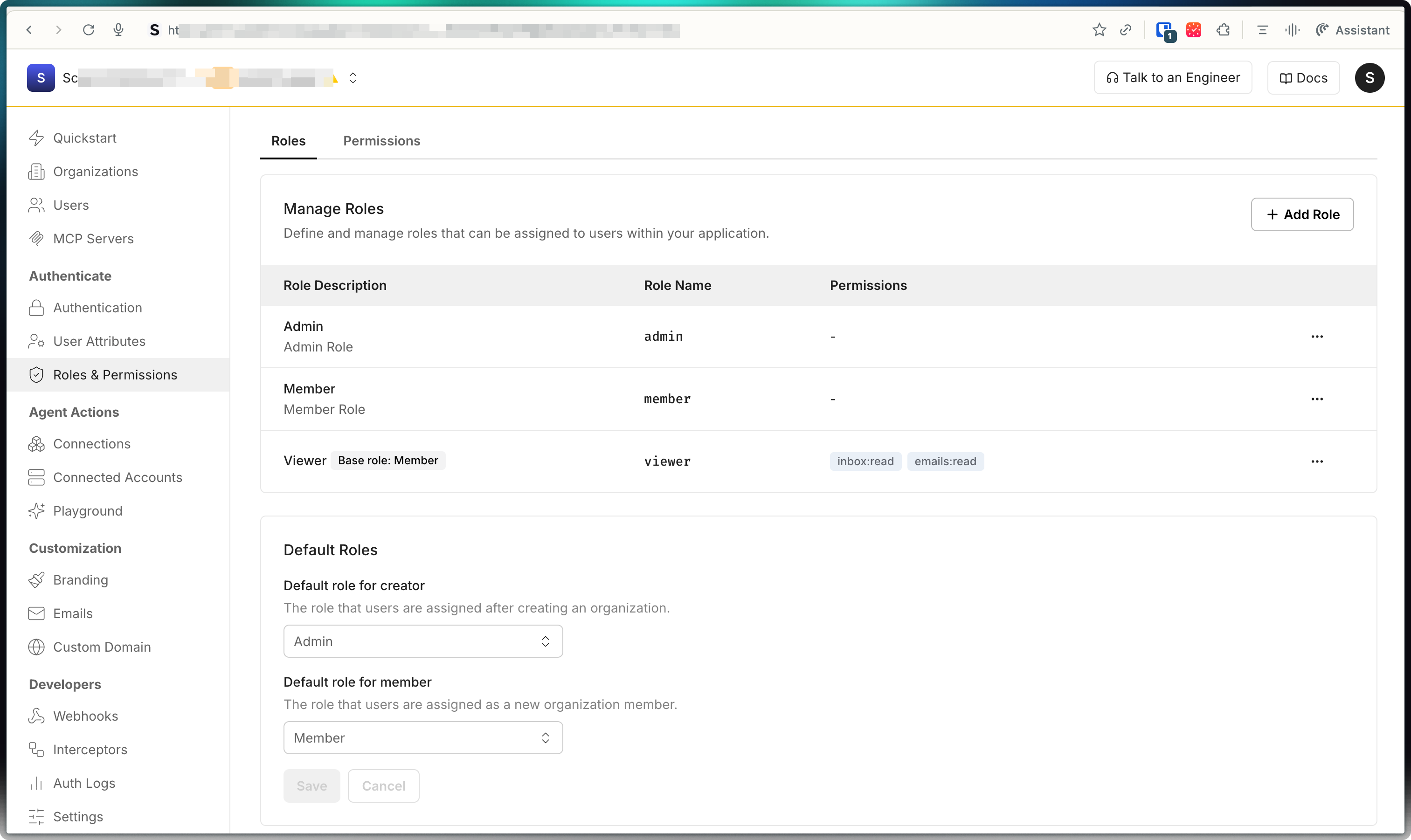 Section titled “Configure organization specific roles”Organization-level roles let organization administrators create custom roles that apply only within their specific organization. These roles are separate from any application-level roles you define.