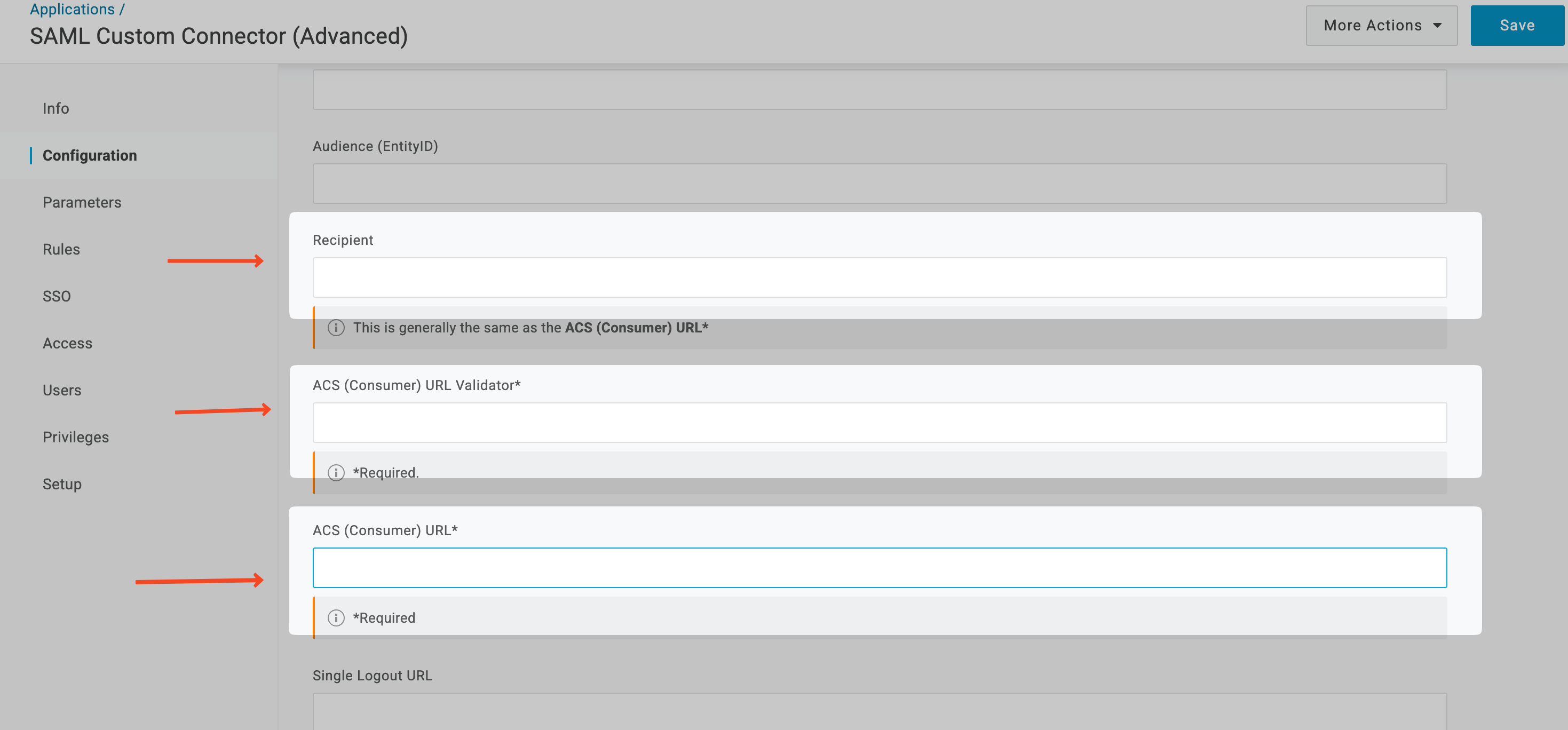 From your SSO Configuration Portal, copy the ACS (Consumer) URL. Go back to your OneLogin Admin Portal, and paste it in the Recipient, ACS (Consumer) URL Validator, and ACS(Consumer) URL fields.
